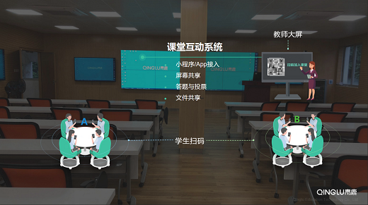 其次,青鹿高校方案支持手機、平板、電腦端(BYOD)接入,其課堂互動系統,支持小程序、APP接入,屏幕共享、答題與投票、文件共享等功能,學生掃碼即可進入課堂。