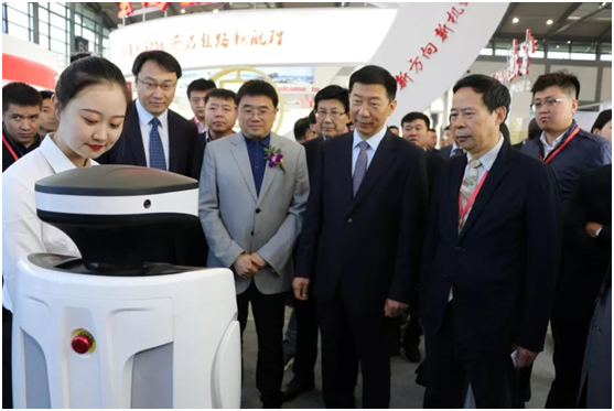 陜西“一帶一路”科技創(chuàng)新創(chuàng)業(yè)博覽會(huì)中,陜西省副省長(zhǎng)趙剛參觀科大訊飛展區(qū),體驗(yàn)訊飛政務(wù)機(jī)器人“小途”