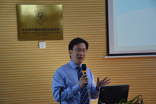 圖為2018年9月份北京四中馬景林校長在北京四中國際課程佳蓮校區開學典禮上講話