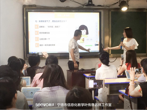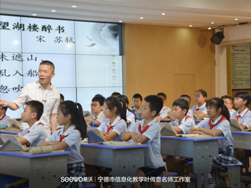 簽約儀式過后,工作室正式開始基于希沃易課堂為載體的課堂教研活動。福鼎實驗小學(xué)的老師們?yōu)閷幍赂骺h市的觀摩老師帶來了一場關(guān)于智慧課堂的盛宴,先給觀摩老師們進行希沃易課堂的培訓(xùn),隨后為各位老師展示基于易課堂為載體的公開課《望湖樓醉書》,得到現(xiàn)場老師們的一致好評。隨著教研活動的不推進,老師對信息化探索的持續(xù)深入,老師們也漸漸的被希沃易課堂所吸引。