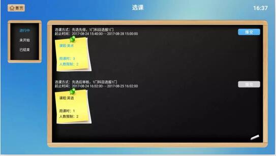 歐帝智慧云班牌加入了走班制的選課、走班功能,學生可以通過平臺進行選課,平臺通過該數據分析形成相應的課程表顯示在班牌終端,學生可以通過班牌上的信息查看自己上課所在的教室,然后通過班牌刷卡考勤到相應的教室上課,教師可通過班牌的考勤數據統計學生上課數據。同時,學生也可以通過班牌反饋聽課情況,以便老師和學校更加直觀的掌握課堂情況,調整教學進度。