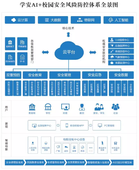 學(xué)安 —“AI+”校園安全風(fēng)險(xiǎn)防控體系應(yīng)用云計(jì)算、大數(shù)據(jù)、物聯(lián)網(wǎng)和人工智能等先進(jìn)技術(shù),以雙重預(yù)防機(jī)制為基礎(chǔ),以事前預(yù)防、事發(fā)預(yù)警、事中應(yīng)急和事后處理的安全閉環(huán)管理為設(shè)計(jì)理念,融人防、物防、技防于一體,通過校園安全云平臺(tái)和校端安全生態(tài)鏈產(chǎn)品建立起局校可視化聯(lián)動(dòng)、共享的校園安全風(fēng)險(xiǎn)防控生態(tài),鑄就“全域、全時(shí)、全程、全員”的360度安全防護(hù)體系,讓校園更陽光。