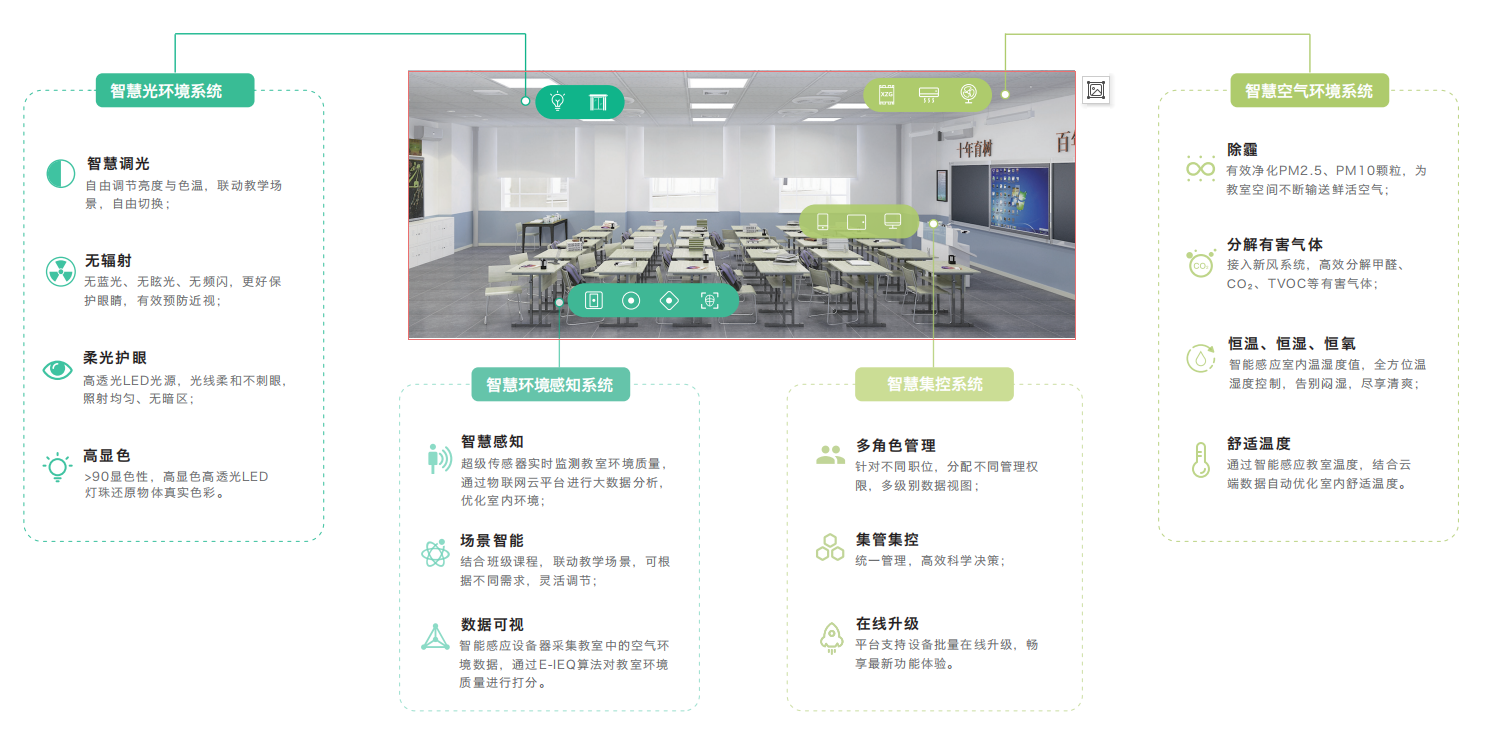數言智慧環境教室的構成分為智慧光環境系統、智慧環境感知系統、智慧集控系統、智慧空氣環境系統。