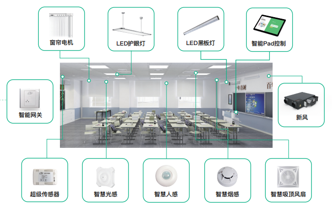 4.實時監測感知教室環境,智能改善環境質量,為教師和學生營造一個健康、舒適、高效的教學環境。