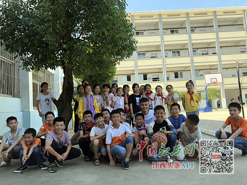 南昌大學(xué)體育專(zhuān)業(yè)實(shí)習(xí)支教生周文俊給宜豐縣新莊鎮(zhèn)中心小學(xué)學(xué)生上籃球課