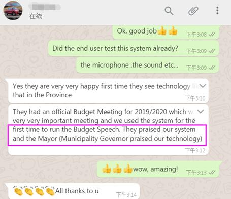 itc高質(zhì)量的產(chǎn)品及優(yōu)秀的服務(wù)得到了客戶(hù)及該市市長(zhǎng)高度贊揚(yáng),為政府開(kāi)啟大型會(huì)議奠定了堅(jiān)實(shí)的設(shè)備基礎(chǔ),感謝客戶(hù)對(duì)itc的選擇與支持,我們將再接再厲,以更好的產(chǎn)品和服務(wù)反饋給客戶(hù)。