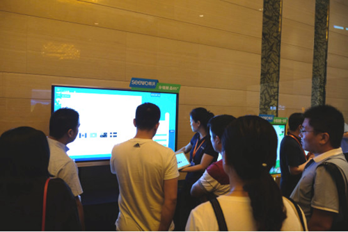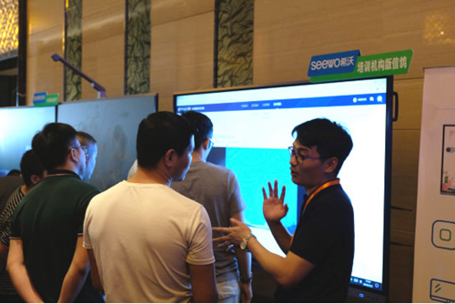 在會場外側,希沃搭建了完整的產品體驗區,直觀地再現了產品應用場景。到場的合作伙伴紛紛駐足詢問、體驗希沃教學一體機、希沃信鴿、希沃白板等每一款產品的特點。