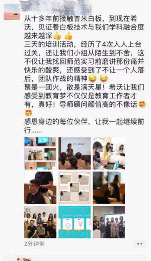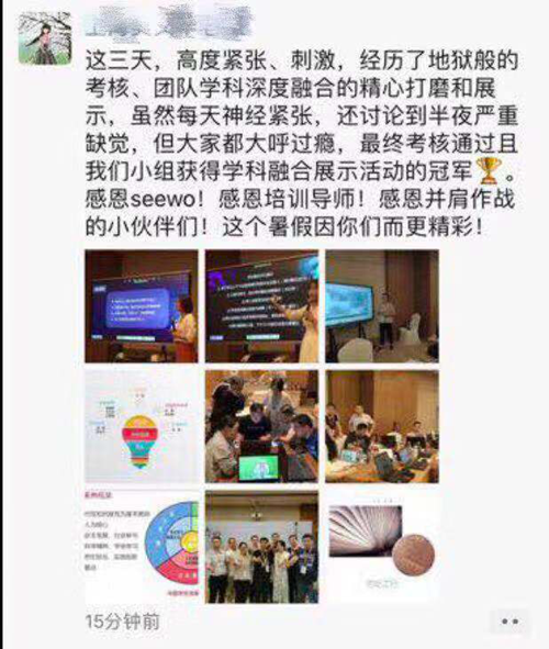 在為期三天的培訓(xùn)中,老師們通過信息化教學(xué)提升系列課程的學(xué)習(xí)、小組研討、課程講解實操、學(xué)科融合案例展示、信息化教學(xué)講解考核等豐富的培訓(xùn)環(huán)節(jié),不斷加強(qiáng)自身的信息化教學(xué)素養(yǎng)。在和希沃金牌講師團(tuán)、其他優(yōu)秀教師的探討、交流、合作的過程中,也不斷加深對教育信息化與教育教學(xué)融合創(chuàng)新的理解。