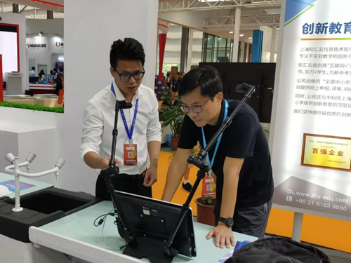 通過場景化、沉浸式的展示,知匯云在展會現場讓嘉賓實際體驗了一把“新中考”理化生實驗操作考,通過現場“考試”來感受產品的優勢。