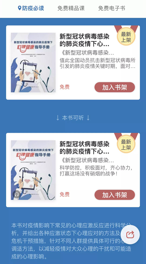 該專(zhuān)題精選最全的防疫必讀書(shū)籍,包括疫情期間公眾的心理自助疏導(dǎo),除了可閱讀的電子書(shū),為方便用戶獲取信息,掌閱還上架了部分書(shū)籍的有聲版本,用聽(tīng)書(shū)的方式普及知識(shí)。
