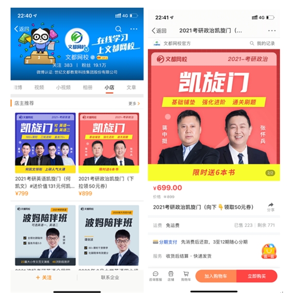 "文都網(wǎng)校"則是教育機構(gòu)用微博推廣課程的典范。2018年5月,文都網(wǎng)校開通了有贊店鋪,并于近期打通微博小店。文都網(wǎng)校不僅官方微博號接入了有贊店鋪,文都旗下的很多網(wǎng)紅老師也都在微博上接入了有贊店鋪,為教輔類書籍、知識付費類課程引流。