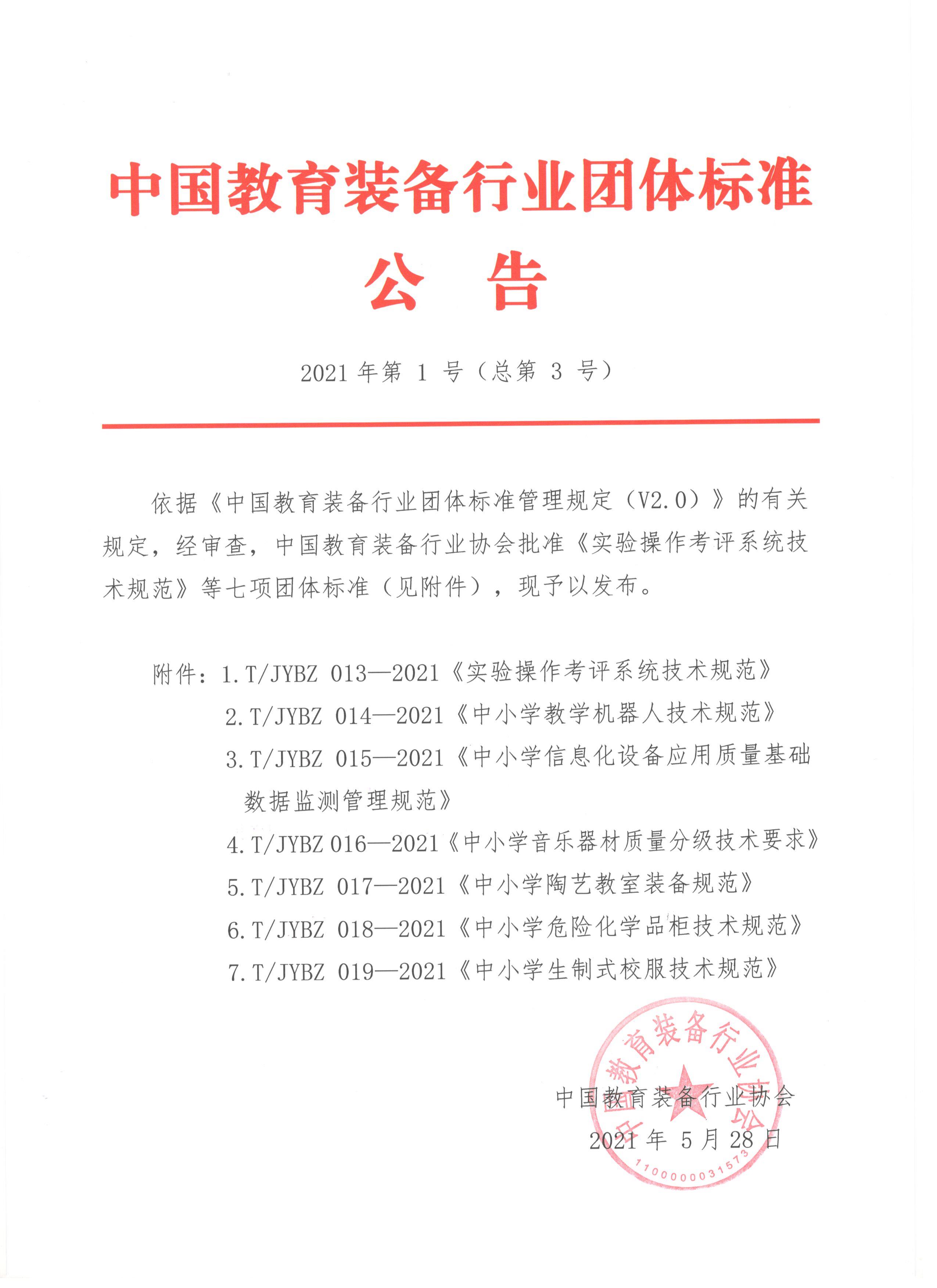 依據《中國教育裝備行業團體標準管理規定(V2.0)》的有關規定,經審查,中國教育裝備行業協會批準《實驗操作考評系統技術規范》等七項團體標準(見附件),現予以發布。