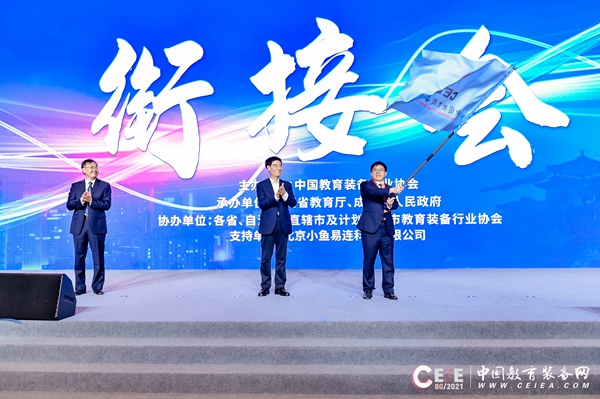 在會旗交接儀式上,四川省委教育工委委員教育廳黨組成員副廳長張瀾濤首先接過會旗,短暫揮舞后交給國家關心下一代工作委員會常務副主任、第80屆中國教育裝備展示會組委會主任王富,王富揮舞旗幟后,將會旗最后交接給了第81屆中國教育裝備展示會承辦方中共江西省委教育工委副書記教育廳廳長郭杰忠。至此會旗成功交接。