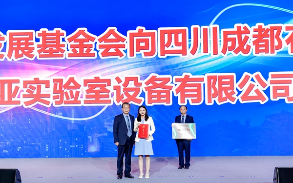 第二個環節,中國教育發展基金會與北京威成亞實驗室設備有限公司2021年“中學綜合實驗室建設項目”落成授牌儀式。中國教育發展基金會向四川成都石室中學授牌,向北京威成亞實驗室設備有限公司頒發捐贈證書。