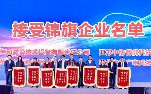 第三個環節,中國教育裝備行業協會向參與公益捐贈活動的會員企業授予錦旗。