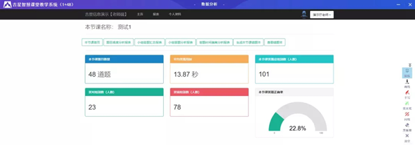 吉星強(qiáng)交互智慧課堂結(jié)合大數(shù)據(jù)分析,自動(dòng)收集學(xué)生課堂測(cè)驗(yàn)的數(shù)據(jù),并形成一系列不同方面數(shù)據(jù)報(bào)表,幫助教師分析全體學(xué)生的學(xué)習(xí)情況,針對(duì)各學(xué)生的薄弱情況進(jìn)行重點(diǎn)教學(xué)。