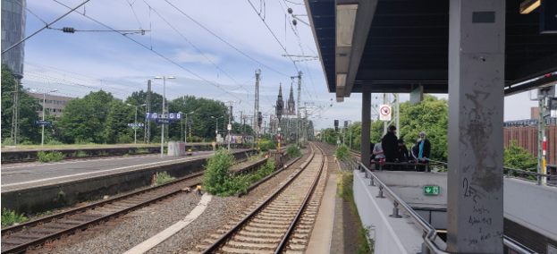 圖1 在展館附近下火車。右邊可見科隆展覽中心的展館建筑,遠(yuǎn)處即為著名的科隆大教堂