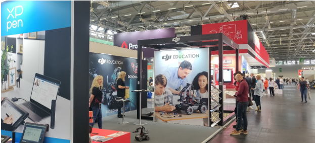 老牌職教企業(yè)FESTO依然占據(jù)最大的職教展位。后來評(píng)選出的明星企業(yè)Promethean的展位并不太大,當(dāng)時(shí)給筆者留下更深印象的交互式學(xué)習(xí)設(shè)備展商是一家總部設(shè)在杜塞爾多夫的日資企業(yè)(圖7)。而慧魚這樣的著名企業(yè)只有一個(gè)展位,奧地利的老朋友——學(xué)生用智慧機(jī)床的廠商Cool Tool公司(圖8)也只有兩個(gè)半展位而已。值得注意的是唯一參展的中國(guó)廠家大疆教育(圖9),他們本次展會(huì)上推出了大疆教育機(jī)器人和無人機(jī),吸引了很多觀眾。但大疆展臺(tái)上都是德國(guó)員工,應(yīng)該是大疆德國(guó)公司的雇員。