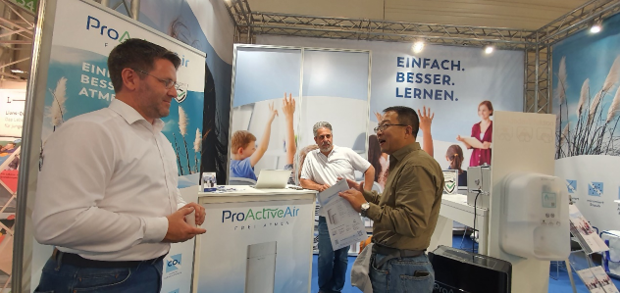 筆者在本次展會(huì)上發(fā)現(xiàn)了一家從事校園衛(wèi)生工作的公司——ProActiveAir,他們主要開發(fā)和推廣空氣凈化設(shè)備(圖12)。研究了一下,其技術(shù)路線主要采用國(guó)內(nèi)比較常見的過濾+等離子技術(shù),主要是借助物理方法進(jìn)行室內(nèi)空氣凈化。因雙方在校園衛(wèi)生方面有高度共識(shí),因此交流十分順暢,筆者也介紹了本公司的二氧化氯空氣消毒技術(shù),期望能夠有所合作。