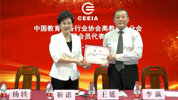 中國教育裝備行業協會會長靳諾為高教裝備分會第四屆理事長,秘書長頒發聘書。