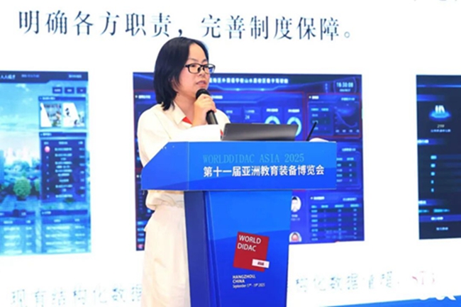 甌海區(qū)教育技術(shù)中心副主任黃菊敏則從甌海區(qū)域?qū)嵺`角度,分享人工智能如何賦能區(qū)域智慧教育生態(tài)重構(gòu)。她以雙向適配為主題,從“基座與賦能”“應(yīng)用與場景”“治理與躍升”三個層面介紹了甌海區(qū)構(gòu)建“甌教云”智能平臺與高質(zhì)量數(shù)據(jù)體系、推進人工智能與教育教學(xué)深度融合、打造數(shù)智驅(qū)動的區(qū)域教育智治生態(tài)的探索,呈現(xiàn)了區(qū)域整體推進智慧教育建設(shè)的“溫州樣本”。