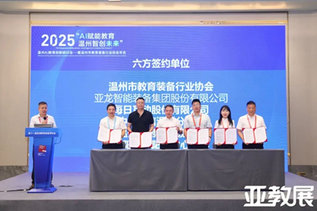 會議期間,通過“政-產(chǎn)-學(xué)-研-用”各方的深度對話,我們凝聚了“共創(chuàng)共贏”的廣泛共識,成功促成溫州市教育裝備行業(yè)協(xié)會、亞龍智能裝備集團股份有限公司、中國電信股份有限公司溫州分公司、每日互動股份有限公司、溫州市第八高級中學(xué)及平陽縣昆陽第二小學(xué)共同簽署六方《2025溫州AI教育創(chuàng)新戰(zhàn)略合作協(xié)議》。