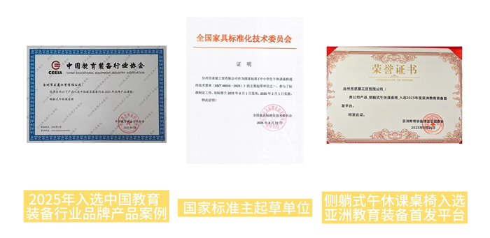 公司擁有一百五十多項課桌椅專利,其中課桌椅發(fā)明專利有十多項。公司榮獲“浙江省AAA級守合同重信用企業(yè)”,“人體工效學認證證書”等成就。公司是國家標準GB/T 46016-2025《中小學生午休課桌椅通用技術(shù)要求》主要起草單位,也是午休課桌椅團體標準起草單位。