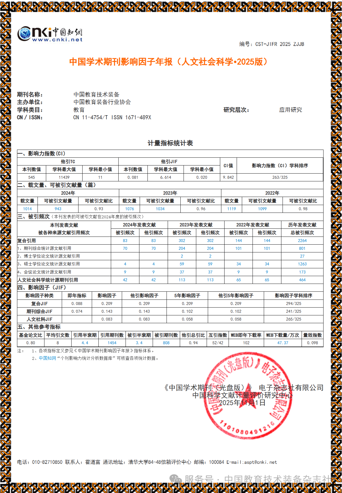 2025年11月,《中國(guó)教育技術(shù)裝備》再次入選中國(guó)知網(wǎng)發(fā)布的《中國(guó)學(xué)術(shù)期刊影響因子年報(bào)》(人文社會(huì)科學(xué)・2025版)。在該年報(bào)收錄的教育學(xué)科領(lǐng)域325種期刊中,《中國(guó)教育技術(shù)裝備》的行業(yè)影響力大幅提升:其中復(fù)合類影響因子從0.089躍升至0.209,增長(zhǎng)11.24倍,增長(zhǎng)率高達(dá)134.83%;而期刊影響力綜合評(píng)價(jià)指標(biāo)——影響力指數(shù)(CI)亦由1.778提升至9.842,增長(zhǎng)5.54倍,增幅達(dá) 453.54%。該數(shù)據(jù)顯示兩項(xiàng)核心指標(biāo)呈倍數(shù)級(jí)增長(zhǎng)。