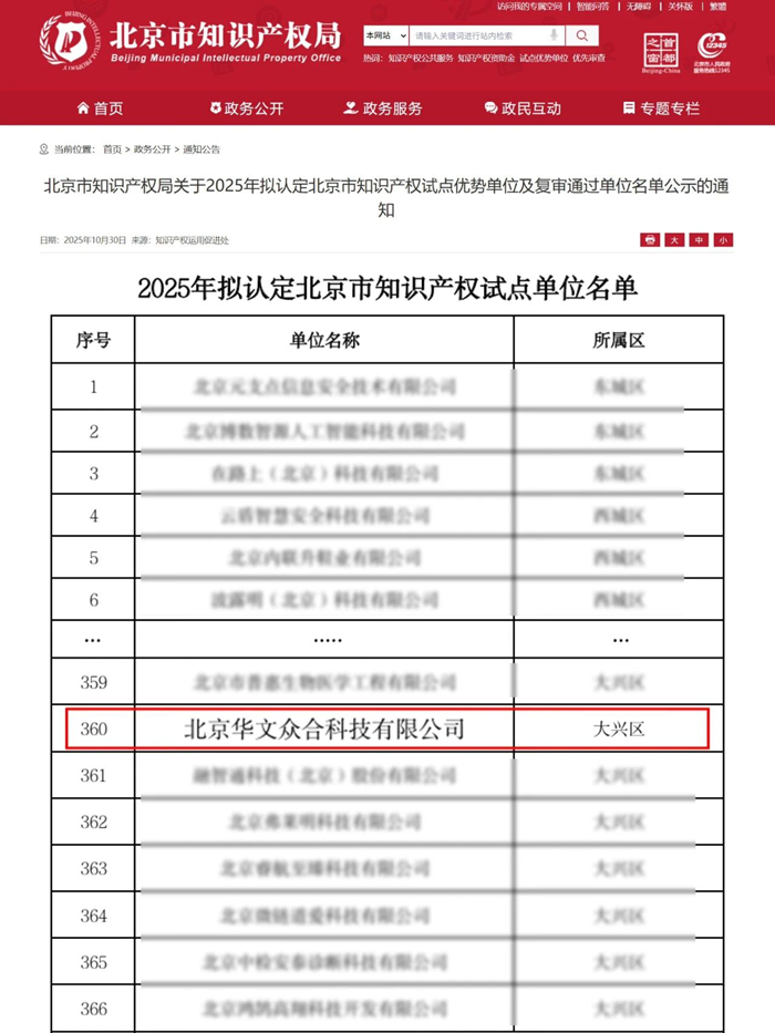 近日,北京市知識產權局公布2025年擬認定北京市知識產權試點優勢單位及復審通過單位名單,北京華文眾合科技有限公司成功入選“2025年擬認定北京市知識產權試點單位”。
