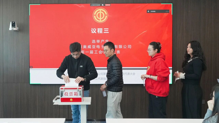 2026年1月8日下午,廣州市奧威亞電子科技有限公司工會第五屆第二次會員代表大會暨第五屆職工代表換屆選舉會議順利召開。公司黨總支副書記趙穎,副總經理、工會主席王洪軍出席會議并講話。