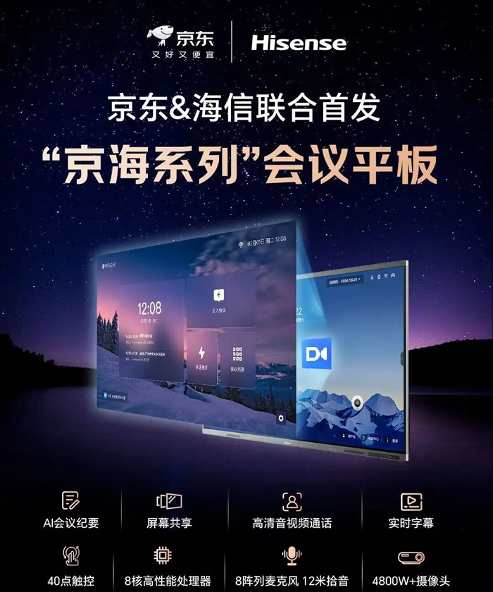 而與京東的深化合作,更讓這份技術實力釋放更大價值。雙方不止于渠道協(xié)同,更邁入“軟硬件深度融合”的新階段——聯(lián)合首發(fā)的京海系列會議平板,將海信XW5F系列旗艦硬件與京東會議專業(yè)軟件能力無縫銜接,打造“硬件+軟件+生態(tài)”一體化解決方案。