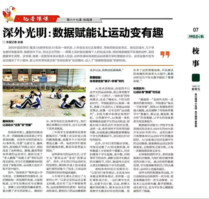 在智慧體育的助力下,深外光明學校“每天一節體育課”的理念得到扎實落地,破解了傳統教學中“難量化、難記錄、難監督、難分析”的問題。學生體質測試優良率從2024年的60%躍升至2025年的78%,運動興趣與身體素質同步提升,真正踐行了“健康第一”的教育理念。