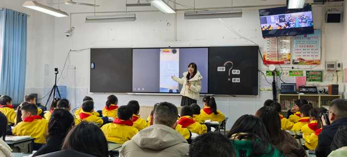 在優質課例展示環節,依托現代中慶研發的互動課堂系統,潼川二小的李皓韻老師通過網絡,連接起內江東興區實驗小學和三臺縣塔山小學,呈現了一節生動而富有創新性的“三師課堂”。