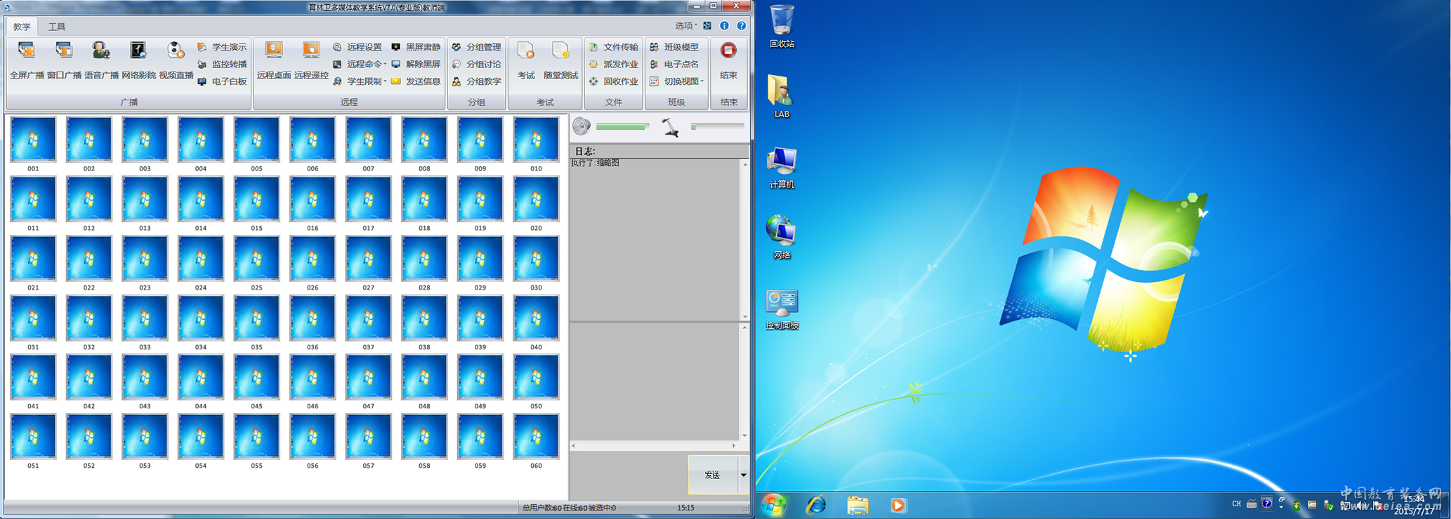 產(chǎn)品詳細介紹 (一)教師端 功能類別 功能名稱 功能概述 網(wǎng)絡(luò)通信 通信方式 通過頻道號進行通信,教師端和學生端的頻道號保持一致即可實現(xiàn)學生端的自動登錄,同時為了滿足實際教學的需要,教師端支持合班與分班教學。 廣播教學 全屏廣播 向?qū)W生端廣播教師端的聲音或圖像,教師端計算機桌面圖像在學生端計算機屏幕上全屏顯示。 窗口廣播 向?qū)W生端廣播教師端的聲音或圖像,教師端計算機桌面圖像在學生端計算機屏幕上以窗口的方式顯示。 語音廣播 廣播老師機計算機及麥克風的聲音給學生機,以實現(xiàn)實時的語音教學。 學生演示 老師指定某些學生在計算機上演示某些操作給其他學生,如果在演示過程中有錯誤的操作,老師可以及時在教師機幫助糾正,如指定某學生向其他學生示范如何安裝office辦公軟件等。 電子白板 即黑板的功能,老師機打開電子白板,使用教學使用的教鞭、直線、曲線、字體等等工具,供老師隨時在白板上寫入,實時的廣播給學生機,方便老師教學。 教學管理 班級模型 針對不同的上課班級,進行學生ICON的位置排列及別名的命名存為該班級的模型,等后續(xù)老師上課時,直接加載該班級模型即可實現(xiàn)快速教學。 電子點名 上課時,老師檢查學生的出勤狀況,電子點名后,可以及時生成該堂課的出勤狀況。 修改學生端頻道 遠程單一或批量修改學生端的頻道數(shù)。 斷線鎖屏 當老師在教學的過程中,學生端出現(xiàn)斷線(網(wǎng)線被拔掉、IP被修改等現(xiàn)象)時會自動鎖定學生端計算機的屏幕。 同步用戶操作系統(tǒng)時間 同步教師端計算機與學生端計算機的操作系統(tǒng)時間。 視圖切換 切換學生ICON在教師端上的排列方式,縮略圖排列、詳細列表排列、大圖標排列、小圖標排列。 黑屏肅靜 鎖定學生端計算機的屏幕。 取消黑屏肅靜 解鎖學生端計算機的屏幕。 視頻教學 網(wǎng)絡(luò)影院 老師可以把一些對教學有幫助的視音頻文件通過網(wǎng)絡(luò)影院的功能,播放給的學生觀看學習。 視頻直播 老師機計算機可以外接攝像頭、DVD影碟機等外部的設(shè)備播放相關(guān)的教學材料。 分組教學 分組管理 對所有的學生端進行分組,并且指定分組中的成員。 分組討論 老師設(shè)定相關(guān)的話題或情境,指定相關(guān)的分組進行討論。 分組教學 每組指定一名組長,讓該組組長去對組中的成員進行教學指導(dǎo),老師可以實時地監(jiān)看組長的教學進程。 文件操作 文件傳輸 發(fā)送文件或文件夾給在線的學生。 派發(fā)作業(yè) 老師向?qū)W生機派發(fā)作業(yè)。 回收作業(yè) 老師回收學生的作業(yè)。 常用工具 浮動工具條 浮動工具條放置常用的教學功能,在教師端操作界面最小化的時候,方便老師授課選擇。 屏幕錄制 老師開啟屏幕錄制的功能,把老師的授課內(nèi)容全程或部分錄制下來,以備課后的溫習。 遠程管理 遠程監(jiān)看 每個學生機的畫面實時地顯示在老師機的屏幕上,老師可以及時地了解學生正在進行的學習進度。 遠程控制 當學生使用計算機在完成老師布置的任務(wù)時,遇到瓶頸時,可以請老師進行協(xié)助,此時老師不需要走到學生的計算機處,僅在自己的計算機上就可以對學生進行遠端指導(dǎo),遠程遙控學生的計算機。 遠程命令 老師在授課的過程中,可以按需及時打開學生機計算機的小工具(如計算器、小畫家等)供教學使用。 遠程設(shè)置 遠程設(shè)置設(shè)定學生端計算機的音頻、分辨率、電源參數(shù)。 遠端開機 在教師端遠程開啟學生端的計算機。 遠程關(guān)機 在教師端遠程關(guān)閉學生端的計算機。 遠程重新啟動 在教師端遠程重新啟動學生端的計算機。 遠程登錄Windows 在教師端遠程幫助學生機登錄Windows操作系統(tǒng)。 遠程注銷Windows 在教師端遠程幫助學生機注銷Windows操作系統(tǒng)。 遠程關(guān)閉應(yīng)用程序 在教師端遠程關(guān)閉與此時教學活動無關(guān)的學生機應(yīng)用程序。 遠程修改學生端密碼 在教師端遠程修改學生端程序的密碼。 上網(wǎng)控制 控制學生端上網(wǎng),提供了網(wǎng)址過濾和進程過濾,可以很好地控制學生通過IE或是通訊等程序上網(wǎng),可以通過黑、白名單的方式去智能化地控制學生機的上網(wǎng)范圍,完美地實現(xiàn)對上網(wǎng)控制與教學的協(xié)調(diào)。 U盤限制 限制學生機對于讀寫USB存儲設(shè)備的啟用與禁用,可以有效地防止學生攜帶游戲到電教室中。 光驅(qū)限制 限制學生機的物理光驅(qū)和虛擬光驅(qū)的使用,提供啟用與禁用兩個選項供老師選擇,可以很好地防止通過光驅(qū)拷貝數(shù)據(jù)到電教室。 禁止發(fā)言 老師可以根據(jù)教學時間的靈活地啟用和禁用發(fā)言的功能,讓學生在適當?shù)臅r間進行發(fā)言。 禁止舉手 防止學生調(diào)皮胡亂舉手,老師可以在師生互動時實時地啟用舉手,讓學生舉手,在其他時候禁用舉手。 遠程卸載 在產(chǎn)品更新?lián)Q代或重新部署時,老師可以在教師端實現(xiàn)遠程批量卸載學生端,無需到學生機處去逐臺卸載學生端程序。 禁止提交文件 禁止學生在不恰當?shù)臅r候提交文件,只有老師取消禁止后,學生才能提交文件,有效地維護了提交文件的秩序。 遠程資訊 上網(wǎng)記錄 記錄學生端使用IE等瀏覽器或是可以聯(lián)網(