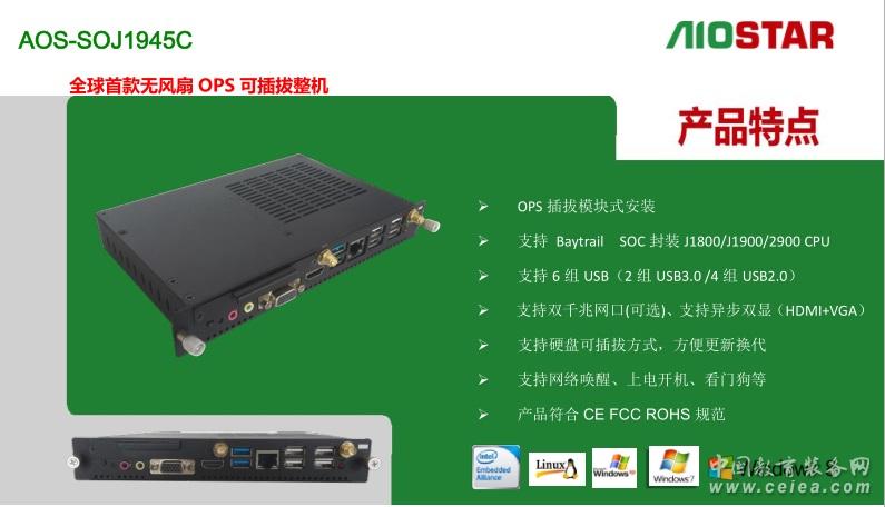 1概述編輯 Aiostar OPS 全稱為:Aiostar Open Pluggable Specification,開放式可插拔規范。是Intel與顯示器廠商共同制定的標準化數字標牌接口規范。OPS內部組成是一個X86架構的迷你PC,采用英特爾酷睿處理器,配有內存、硬盤、多種輸入輸出接口以及Windows操作界面,尺寸為200mm x 119mm x 30mm 。 以下為Intel 官網對于OPS的定義: 原文如下: Digital Signage Open Pluggable Specification :Simplify digital signage development Highlights Enables easier installation, use and maintenance of digital signs. Makes digital signage devices more intelligent and connected. Overview The open pluggable specification (OPS) helps standardize the design and development of digital signage devices and pluggable media players. Intel created OPS to address digital signage market fragmentation and simplify device installation, usage, maintenance and upgrades. OPS enables digital signage manufacturers to deploy interchangeable systems faster and in higher volumes, while lowering costs for development and implementation. Installing digital signage equipment based on Intel architecture helps you implement scalable digital signage applications that can network easily with other equipment. This simplifies interoperability and application upgrades designed to meet the digital signage requirements of individual customers, while helping to future-proof technology investments.[1] 譯文: 強調 更便于安裝、使用和維護的數字信號。 使數字看板設備更智能和融合。 概述 開放的可插拔的規范(OPS)有助于規范的設計和開發數字看板設備,并插入媒體播放器終端。Intel創造OPS 致力于數字看板市場分化和簡化設備安裝、使用、維護和升級。 OPS可以使數字看板制造商更快部署大量的交互系統,同時降低開發和實現的成本。 安裝基于英特爾架構的數字標牌設備可以幫助您實現可伸縮的數字看板應用程序,并且很容易和其他設備進行網絡連接。這簡化了通過交互和升級的設計來滿足個人客戶的數字看板需求,同時有利于面向未來的技術投資。 2特點編輯 1、支持數字標牌等行業最新的OPS規范的電腦模塊,加速數字標牌行業的標準化趨勢。 2、OPS模塊可以簡化設備的安裝、使用、維護和更新,幫助數字標牌制造商降低開發和實施成本。 3、OPS可簡便地與其它設備聯網,可擴展數字標牌應用,滿足數字標牌對交互和應用更新的需求。 4、部分OPS平臺支持遠程管理及低功耗模式,解決耗電及散熱要求。同時平臺所支持的Intel vPro、AMT遠程管理技術,實現設備無人操控下的高效運作。如采用四代i5+Q87平臺的AOS-SOQ8I45A 5、OPS無風扇散熱設計,提供超靜音的解決方案,保證工作環境的安靜、清爽。發熱量小也帶來了較小的功耗。 3整機編輯 Intel 2011年提出該規范后,伴隨著日本NEC OPS接口顯示器的上市,傳統數字標牌嵌入式主板走下神壇,OPS模塊化正式開啟。代表作品有 愛鑫微電子(AIOSTAR) AOS-SOH8I45A ,