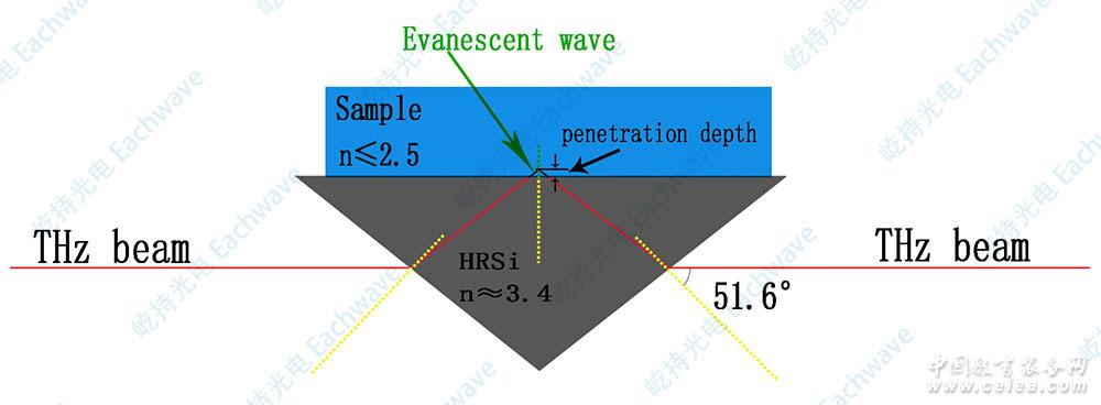 產(chǎn)品詳細(xì)介紹產(chǎn)品簡(jiǎn)介 太赫茲是近年來科研領(lǐng)域一個(gè)非常熱門的研究方向,太赫茲時(shí)域光譜測(cè)試技術(shù)則是一門新興的正在蓬勃發(fā)展的技術(shù)。目前國(guó)內(nèi)外物理學(xué)、光學(xué)相關(guān)領(lǐng)域的科研實(shí)驗(yàn)室大多已經(jīng)裝備了太赫茲時(shí)域光譜測(cè)試設(shè)備,進(jìn)行超材料、半導(dǎo)體材料等的研究。然而太赫茲光譜很具特色的生物大分子識(shí)別特性卻很少得到真正的實(shí)際應(yīng)用。 Eachwave推出的太赫茲衰減全反射測(cè)試模塊,主要針對(duì)含水量多的細(xì)胞、組織等樣品,可以通過衰減全反射的方式測(cè)試出樣品對(duì)太赫茲波譜的吸收譜。可以真正的將太赫茲波譜的生物大分子指紋識(shí)別特性應(yīng)用于生物樣品的分析測(cè)試中去。讓更多人的生物科研用戶多了一個(gè)新型的強(qiáng)而有力的樣品分析研究手段。 太赫茲衰減全反射測(cè)試,專門用于測(cè)試對(duì)入射的太赫茲光譜具有強(qiáng)烈吸收的樣品。太赫茲波段的衰減全反射模塊核心部件是一塊高阻硅(HRSi)棱鏡,HRSi在太赫茲波段(0.1-4THz)具有平坦且很高的折射率,在0.1-4THz,HRSi折射率約為3.416。 如下圖所示,太赫茲光束經(jīng)過高折射率的高阻硅(HRSi)棱鏡,入射到小折射率的樣品上,在樣品與高阻硅(HRSi)界面全反射,此過程中,太赫茲(THz)光束會(huì)在樣品中有一定的穿透深度,即全反射過程中產(chǎn)生的倏逝波會(huì)在樣品中傳播一段距離并最終攜帶樣品的信息反射出來。通過這種方法可以測(cè)試對(duì)太赫茲波吸收強(qiáng)烈、不能用常規(guī)透射或反射方法測(cè)試的樣品(如生物樣品、細(xì)胞蛋白質(zhì)等)。
