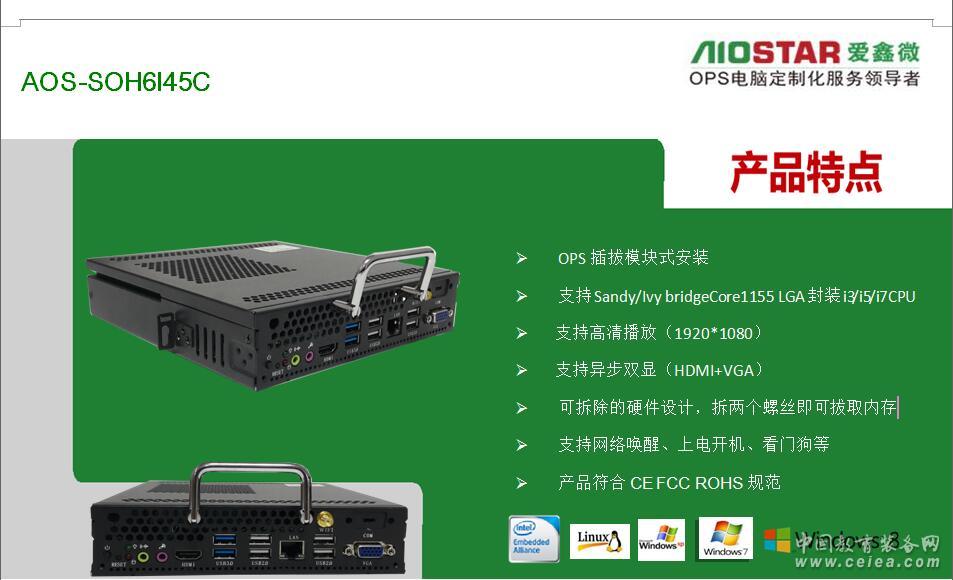 產(chǎn)品詳細(xì)介紹深圳市愛(ài)鑫微電子有限公司為更好的配合不同廠家的要求,可提供OPS主板與OPS準(zhǔn)系統(tǒng)的方案配合各個(gè)廣告機(jī),觸控一體機(jī)廠家,多媒體壁掛式教學(xué)一體機(jī),數(shù)字標(biāo)牌,錄播觸控一體機(jī),同時(shí)保證所提供OPS主板與OPS插拔式電腦/OPS-C插拔式電腦主機(jī)是完全按照INTEL OPS規(guī)范定義的,完全支持鴻合教育一體機(jī)、東方中原教育一體機(jī)、創(chuàng)維教育一體機(jī)、康佳教育一體機(jī)、中銀液晶觸控一體機(jī)、中電數(shù)碼教育一體機(jī)、海爾觸控一體、TCL觸控一體機(jī)、KTC/HKC/HPC等各大交互式教育觸控一體機(jī)廠家,愛(ài)鑫微電子提供專業(yè)的定制化服務(wù)OEM/ODM. 聯(lián)系電話:18620397178 QQ:46078934 現(xiàn)階段我司已推出了一系列OPS電腦方案如下: 頂極OPS插拔式電腦方案:H110+6代CPU+2G獨(dú)立顯卡(GT730/GT850/GT950) 高端:H110+6代CPU (市場(chǎng)最新方案 4K極清方案)歡迎客戶取樣測(cè)試。支持4組USB3.0+3組USB2.0+3組異步顯示(VGA+HDMI+DP)+3組網(wǎng)口(可以直接接IP攝像機(jī)進(jìn)行錄播與監(jiān)控或者網(wǎng)絡(luò)內(nèi)外網(wǎng)隔離進(jìn)行封標(biāo)) 中高端:H81+4代CPU/HM86+4-5代CPU(市場(chǎng)主流) 中端:H61+2-3代CPU/HM65+2-3代CPU(高性價(jià)比) 低端:baytrailJ1800/J1900無(wú)風(fēng)扇低成本的OPS電腦(幼教觸控一體機(jī)專用) 深圳市愛(ài)鑫微電子有限公司(以下簡(jiǎn)稱“AIOSTAR”)是一家集研發(fā)、生產(chǎn)和銷售于一體的高新技術(shù)企業(yè),同時(shí)是Intel、AMD、NVIDIA等芯片廠商緊密的合作伙伴。公司主營(yíng)工業(yè)主板(ITX/3.5寸/NANO等)、媒體播放主機(jī)、OPS主機(jī)、OPS可插拔式電腦模塊、OPS主板、BOX-PC、網(wǎng)絡(luò)安全硬件平臺(tái)、服務(wù)器、工業(yè)平板電腦、一體化工作站等產(chǎn)品。目前,產(chǎn)品已廣泛應(yīng)用于DS、MIDS、IWB、POS、自助查詢、零售金融、工業(yè)自動(dòng)化,智能交通,網(wǎng)絡(luò)信息安全,通訊、智能安防,云計(jì)算、石油石化、醫(yī)療、軍事裝備等多個(gè)領(lǐng)域。公司高度重視客戶的需求和滿意度,針對(duì)不同的客戶需求,能夠快速做出積極的響應(yīng),為其進(jìn)行量身設(shè)計(jì)并提供個(gè)性化的OEM/ODM服務(wù)。 愛(ài)鑫微電子本著以“人才是企業(yè)的財(cái)富,效益是追求的目標(biāo),發(fā)展是永恒的主題”為宗旨;以“客戶至上,品質(zhì)為尊“為原則;提倡“博愛(ài)”“齊鑫”“微天下”的意愿,愿與全球各地的企業(yè)商家攜手合作,共謀發(fā)展! 規(guī)格參數(shù) 處理器 CPU Intel英特爾 Core酷睿 i3-3220 (雙核四線程/3.3GHz/3MB三級(jí)緩存/HD2500/22nm/54W/LGA1155) 芯片組 Intel® H61/B75 BIOS AMI 32Mbit,支持無(wú)盤(pán)啟動(dòng)、網(wǎng)絡(luò)喚醒、上電開(kāi)機(jī)、看門(mén)狗等功能 內(nèi)存 容量 4GB SO-DIMM DDR3 1333 MHz memory , Max.8GB 存儲(chǔ) SATA接口 MINI PCIE 2.5〞5400rpm 500G 1xMini PCIE 顯示 芯片組 輸出