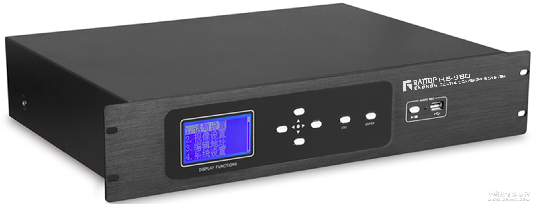 產品詳細介紹HS-980系列是一款全新高集成主機,采用數字技術為核心,自帶2.8寸液晶屏,獨立按鍵操作;內置高性能CPU,支持討論功能;具有多種會議模式:FIFO(先進先出模式)、LIFO(后進先出模式)、FREE(全開放模式)、C-ONLY(主席模式);可設置發言數量、自動關閉、限時關閉、聲控發言等功能。主機和電腦可以通過TCP/IP網絡或者USB本地方式進行連接通訊;把先進的數字技術、網絡技術和音頻技術充分地結合起來。與智能中央控制系統、視頻會議系統、監控防火系統實現了無縫連接。 自帶2.8寸液晶屏,獨立按鍵操作; 采用全數字技術為核心,內置高性能CPU; 可設置發言數量、自動關閉、限時關閉、聲控發言等功能; 具有多種會議模式: FIFO(先進先出模式)、LIFO(后進先出模式)、FREE(全開放模式)、C-ONLY(主席模式); 音頻信號采用32bit高速浮點DSP進行處理, 帶寬20Hz-20KHz完美清晰音質; 高性能開關電源供電,長距離傳輸對音質不會有任何影響;抗干擾電路設計,杜絕一切手機信號的干擾; 四路話筒連接,每路支持30個單元,可接120個單元,支持12支主席單元; 支持級聯,方便多套系統同時使用,共同管理; 具有S端子和5P接線端子接口,連接標清或高清攝像頭,支持SONYVISCA、EVI HD、PELCO P/D、BRC300通訊協議; 內置6進2出(RCA接口)視頻器,最多可連接6個標清攝像頭; 主機和電腦可以通過TCP/IP網絡或者USB本地方式進行連接通訊,使用PC軟件對系統進行設置,亦可不需電腦直接在主機上對系統進行設置,支持在線更新代碼; 支持USB錄音,高保真WAV格式輸出,多路音頻輸入輸出接口,可連接擴聲或錄音設備; 多功能擴展:帶視頻切換RS-232通訊接口,可連接高清視頻切換器;可連接中控系統,實現對系統的控制; 具有報警信號輸入接口,當有緊急信號時候,自動暫停會議,并向與會單元發送報警信息; 標準的機柜式設置,可安裝19英寸標準機柜上,易于存放和保管。 技術參數: 中控鏈接口 232串口x1 電腦接口 USB接口 音頻輸入 RCA(蓮花插頭)X2 6.3mm插頭X1(報警音頻) 音頻輸出 RCA(蓮花插頭)X2 6.3mm插頭X1XLR卡儂插座X1 外部尺寸(mm) 483x323x90mm 顏色 黑色拉絲 安裝方式 19英寸標準機柜 主機供電 AC110V-220V/50Hz 頻率響應 20Hz-20KHz 信噪比 >96dBA 總諧波失真 <0.05% 錄音接口 USB接口 話筒單元接口 圓頭DIN-8插座接口x4 級聯接口 圓頭DIN-8插座接口x2 |