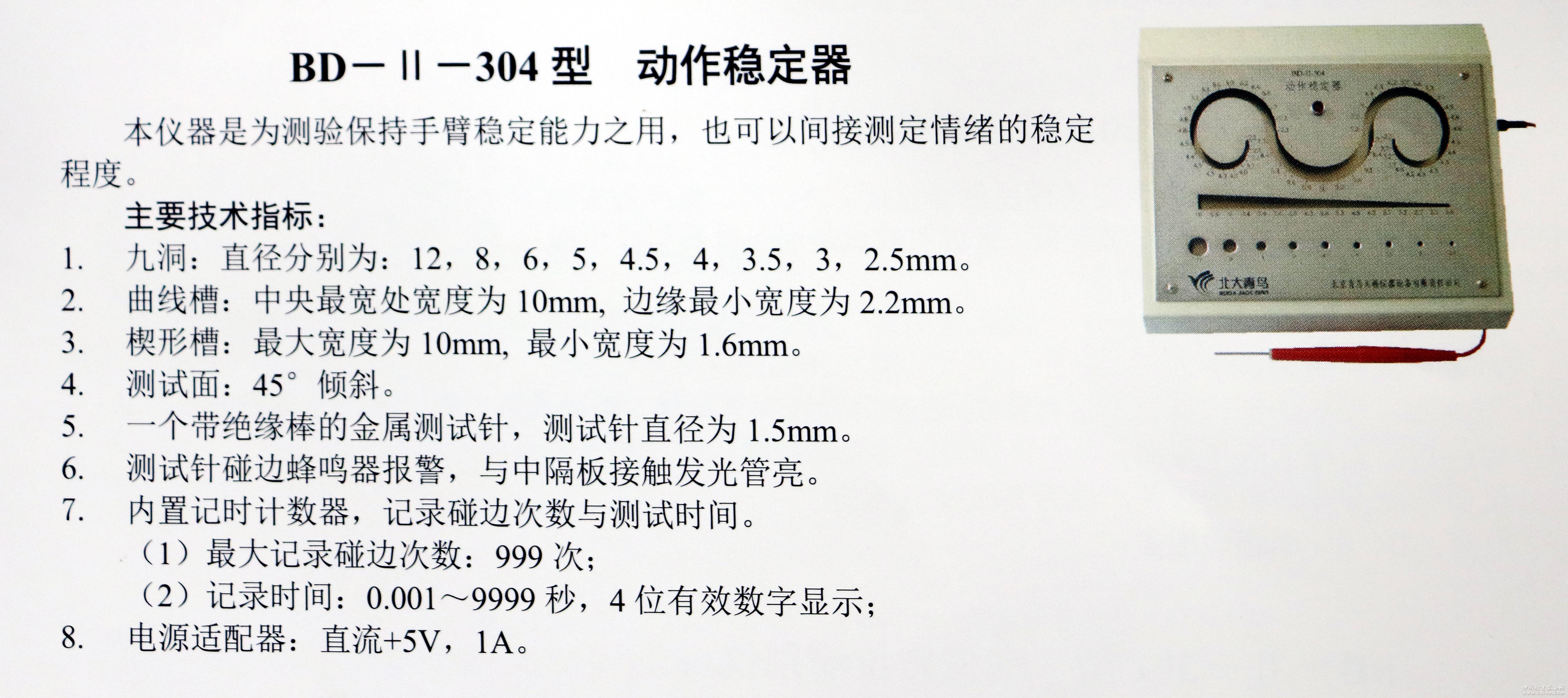 產(chǎn)品詳細(xì)介紹測(cè)試保持手臂穩(wěn)定的能力,可間接測(cè)量被試情緒的穩(wěn)定程度。⒈九洞直徑分別為2.5,3,3.5,4,4.5,5,6,8,12mm。⒉曲線槽中央最寬處寬度為:10mm,邊緣最小寬度2.2mm、⒊楔形槽最大寬度為:10mm,最小寬度1.6mm、⒋測(cè)試針直徑1.5mm,帶接計(jì)數(shù)器的插座。⒌DC 6V電源適配器。 |