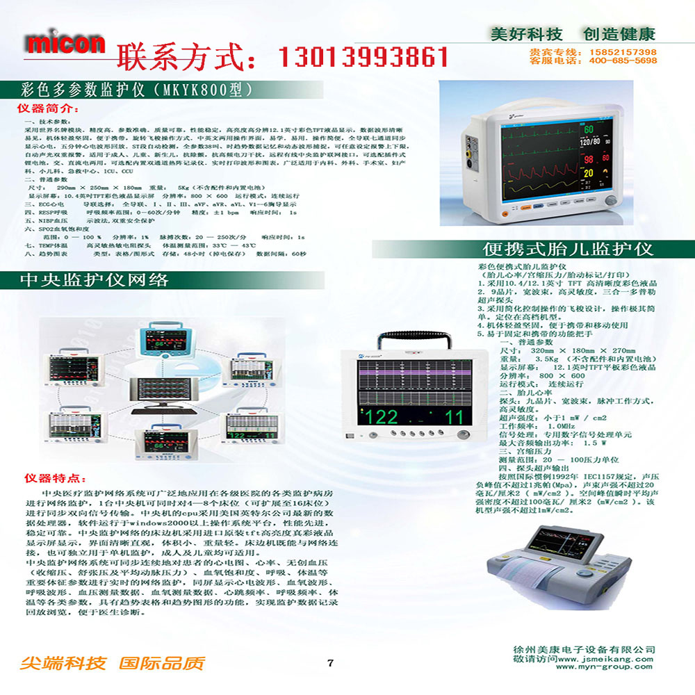 產品詳細介紹產品簡介 多參數監護儀 大屏幕TFT真彩LCD顯示 輕便易攜帶,交直流供電,不間斷監護 內置高容量電池,使用時間可達5小時以上 簡易直觀的操作方式, 各參數數值和曲線的顯示顏色可任意調節 96小時趨勢信息存儲回顧,90分鐘心電波回放 具有防除顫和抗高頻電刀干擾能力,適應各種臨床環境 采用數字血氧技術,對弱灌注和手指抖動均能準備測量 全模塊化內部結構,便于維護和升級 聲光報警,準確傳達病情 Ip網絡接口,可組建任意臺數的中央監護系統 標準配置: ◇ 心電/心率 ◇ 血氧飽和度 ◇ 無創血壓 ◇ 呼吸 ◇ 體溫 ◇ 脈搏 選配: ◇ 內置打印機 ◇ 新生兒、兒童特殊配件