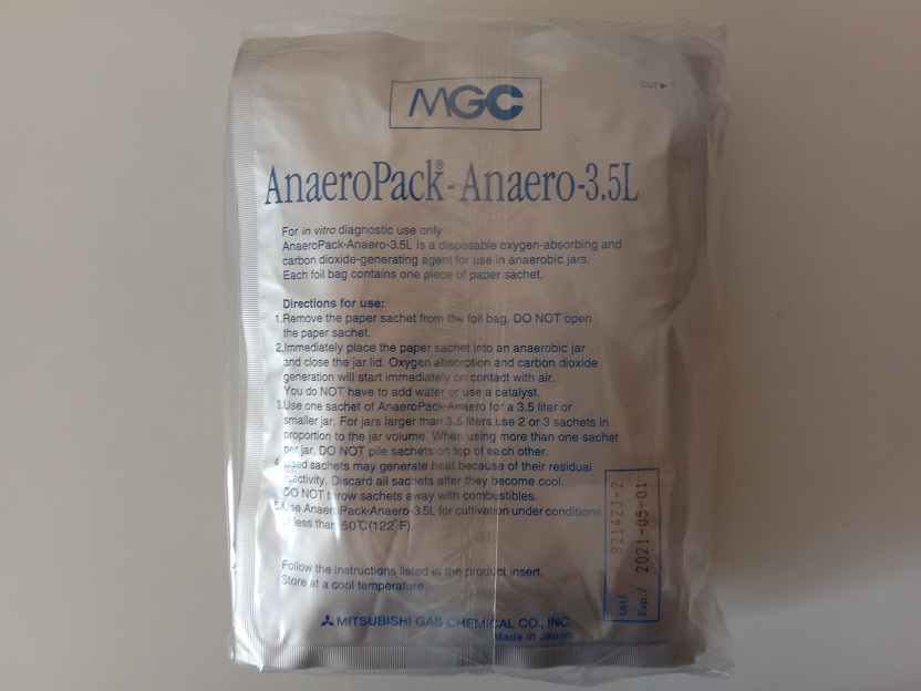 產品詳細介紹有批發價格,1包即可按批發價格供應,含13%專票運費,具體批發價格請您咨詢北京緣生化科技有限公司安經理。 北京緣生化科技有限公司作為專業培養產品供應商,產品涵蓋培養類大多數品牌,有著多年的客戶服務經驗,歡迎您的咨詢。在產品質量上,物流快遞發貨方面(8:00-20:00)均可發貨,不耽誤您的寶貴時間。包裝包裹嚴實,保證產品質量。含運費并提供13%專票。 基本程序 :“培養基配制--倒平皿--滅菌--冷卻--接種--放入適合容器--放產氣袋(完全厭氧可同時放置指示劑)--密封--放入普通培養箱--調節適合的培養溫度,即可。配套提供的密封罐或密封袋外觀透明,可隨時關注微生物生長情況,密封容器不打開則內環境不會改變,足以維持整個培養過程�!� - AnaeroPack·厭氧產氣袋(3.5L用),國內代碼C-35,日本番號(型號)D-06 AnaeroPackTM -Anaero 厭氧產氣袋(3.5L)使用說明書 產品用途: 配合密封罐使用,用于厭氧微生物的培養。本品可吸收容器中的全部O2,同時產生約21%的CO2。 每一個鋁塑包裝中含有一片紙袋(厭氧產氣袋)。 使用方法: 1. 將鋁塑包裝上側剪開,取出紙袋,紙袋不需要打開。 2. 立即將紙袋放入密封罐中,將密封罐蓋上。接觸空氣后將即刻吸收O2,產生CO2。不需要加水或使用催化劑。 3. 每袋AnaeroPackTM-Anaero 用于7.0升培養罐,根據培養罐的體積用2包,當使用多袋AnaeroPackTM- Anaero時,不要疊放在一起。 4. 用完的厭氧產氣袋可能會因為剩余反應而產生熱量,請等它們變冷以后再丟棄。且不要跟易燃物丟在一起。 5. AnaeroPackTM- Anaero用于45℃以下培養使用。 儲藏方法: 密封,置陰涼干燥處保存。 保存期: 在鋁塑袋的右下角印有批號及失效期,請在失效期之前使用。 生產商: 三菱瓦斯化學株式會社 MITSUBISHI GAS CHEMICAL CO., INC.