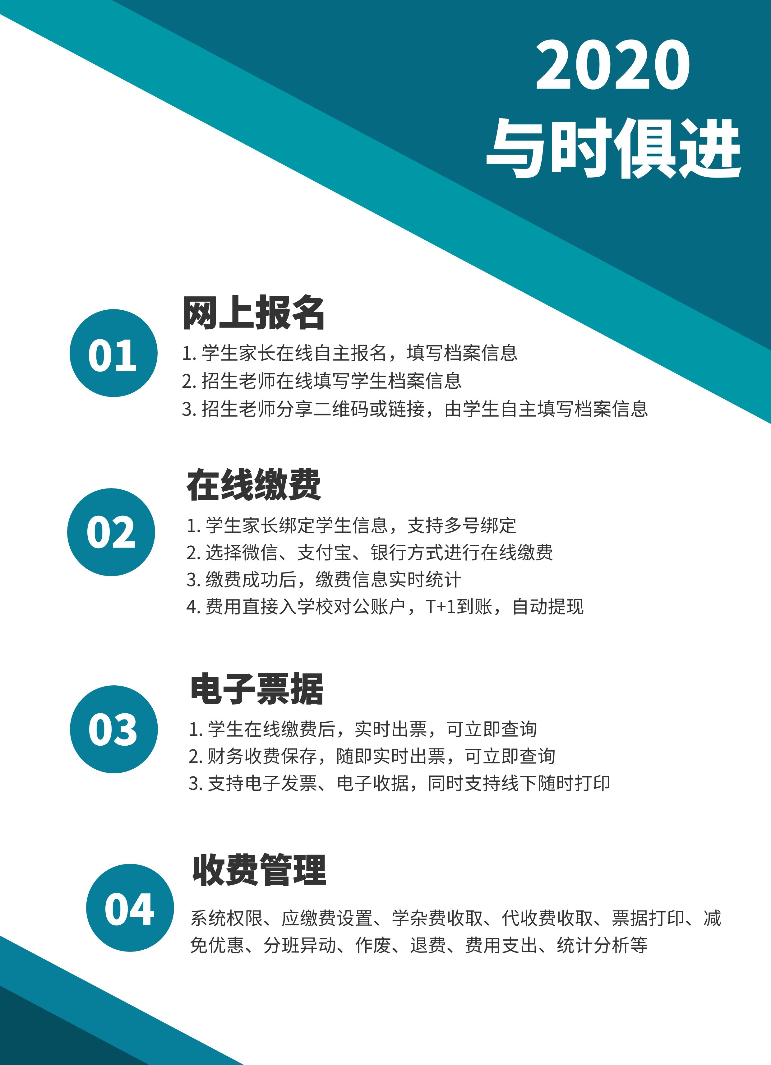 產品詳細介紹產品簡介: 線上線下一體化管理 線下管理+線上服務(招生報名繳費+電子票據) 線下管理主要是解決財務的運營管理問題、各部門數據共享實時、財務收費難清賬難的問題 線上服務主要是解決家長異地報名繳費存票問題,讓財務輕松收費,實時監管