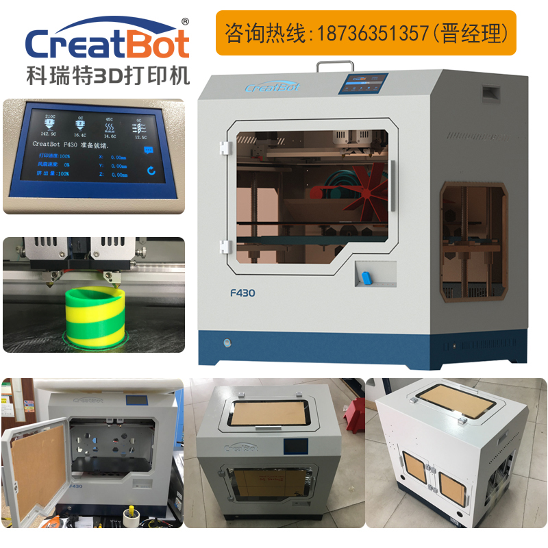 學校招標CreatBot 3d打印機機型參數介紹 F430設備參數: 1.品名:3D打印機 2.品牌:CreatBot/科瑞特 3.型號:F430 4.成型技術:FDM(熔融沉積) 5.打印尺寸:400*300*300mm  6.噴頭數量:2個(雙噴頭3d打印機) 7.噴嘴直徑:0.4mm  8.打印層厚:0.02-0.3mm 9.打印速度:55-120mm/s 10.噴頭最高溫度:260/420°C(一臺3D打印機配四套噴嘴默認安裝一常溫噴頭和一高溫噴頭,并配送常溫和高溫噴頭組件各一套) 11.熱床最高溫度:140°C(新升級配置) 12.工作艙最高溫度:70°C 13.空氣過濾:有空氣過濾功能 14.耗材直徑:1.75mm 15.耗材類型:PLA/ABS/碳纖維/木制/尼龍/PC/PTEG/HIPS/PP/TPU/PVA/PEEK 等 16.機身架構:全封閉精鋼機身、雙Z軸,直線導軌拖鏈架構 17.定位精度:X Y軸定位精度:12.7 微米Z軸定位精度:1.25 微米 18.工作臺:鋼化玻璃面板+BuildTak貼紙 19.操作軟件:CreatWare V6.4.6多國語言版 20.文件類型:STL, OBJ, AMF 21.操作系統:Windows (7,8,10)、Mac OS X 22.操作屏幕:4.3" 彩色觸屏(多國語言) 23.輸出設備:U盤、USB(聯機) 24.電源:100-240V, 50-60Hz 25.機器功率:2000W 26.環境控制:有保溫艙,熱風系統 27.支持功能:自動調平/斷電續打/耗材檢測/自動關機等 28.機器尺寸:620*485*680mm 29.包裝尺寸:750*580*720mm  30.機器重量:48Kg  31.包裝重量:62Kg 產品特點: 1.全封閉金屬機身——時尚外觀設計,機身穩重大方;透明亞克力擋板可封閉打印,安全且便于觀察打印過程。 2.全金屬新式噴頭——近端送絲雙噴頭配置,噴頭熱熔溫度可達420°,打印材料范圍更廣。 3.超大觸摸屏操作——一鍵操作,方便快捷;4.3英寸超大顯示屏,支持中英文多種語言。 4.切片軟件——支持多種語言,默認中文,打印參數可設置默認參數值,操作簡單。 5.斷電續打——意外斷電時,會自動記憶當前位置并存儲打印數據,降低工作臺并回抽耗材。 6.耗材檢測——耗材即將用完時會自動停止打印并退出耗材,更換耗材后可繼續打印。 7.自動關機——打印完成會發出提示音,五分鐘后自動關機,無人值守更放心。