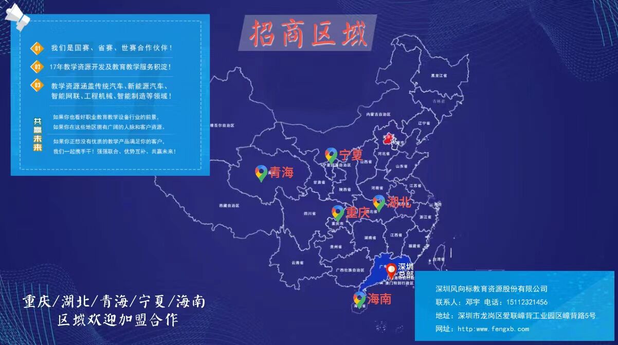 如果你也看好職業教育教學設備行業的前景,如果你在這些地區擁有廣闊的人脈和客戶資源,如果你正愁沒有優質的教學產品滿足你的客戶,我們一起攜手干!強強聯合,優勢互補,共贏未來!