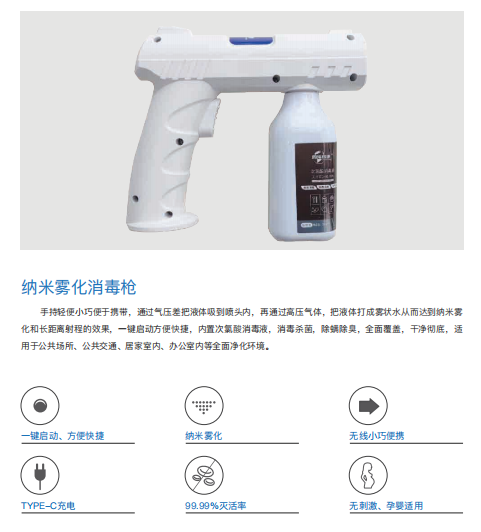 產品詳細介紹手持輕便小巧便于攜帶,通過氣壓差把液體吸到噴頭內,再通過高壓氣體,把液體打成霧狀水從而達到納米霧化和長距離射程的效果,一鍵啟動方便快捷,內置次氯酸消毒液,消毒殺菌,除螨除臭,全面覆蓋,干凈徹底,適用于公共場所、公共交通、居家室內、辦公室內等全面凈化環(huán)境。