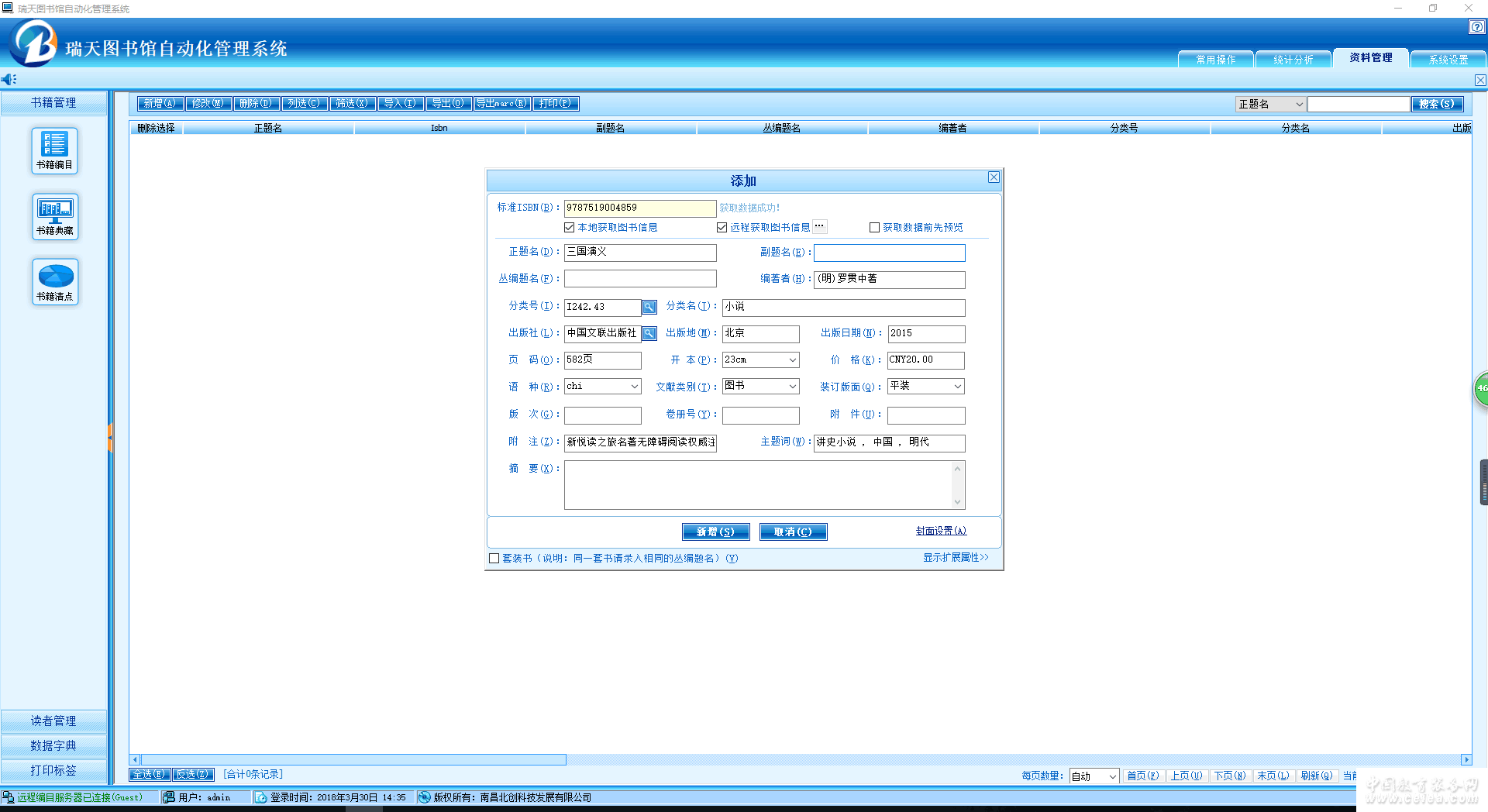 《瑞天書目數據共享平臺》可以在錄入書籍信息時只需要輸入書籍的ISBN碼就可以遠程獲取我們公司服務器里的圖書書目信息,而且我們這個書目數據庫信息目前是完全免費開放的。