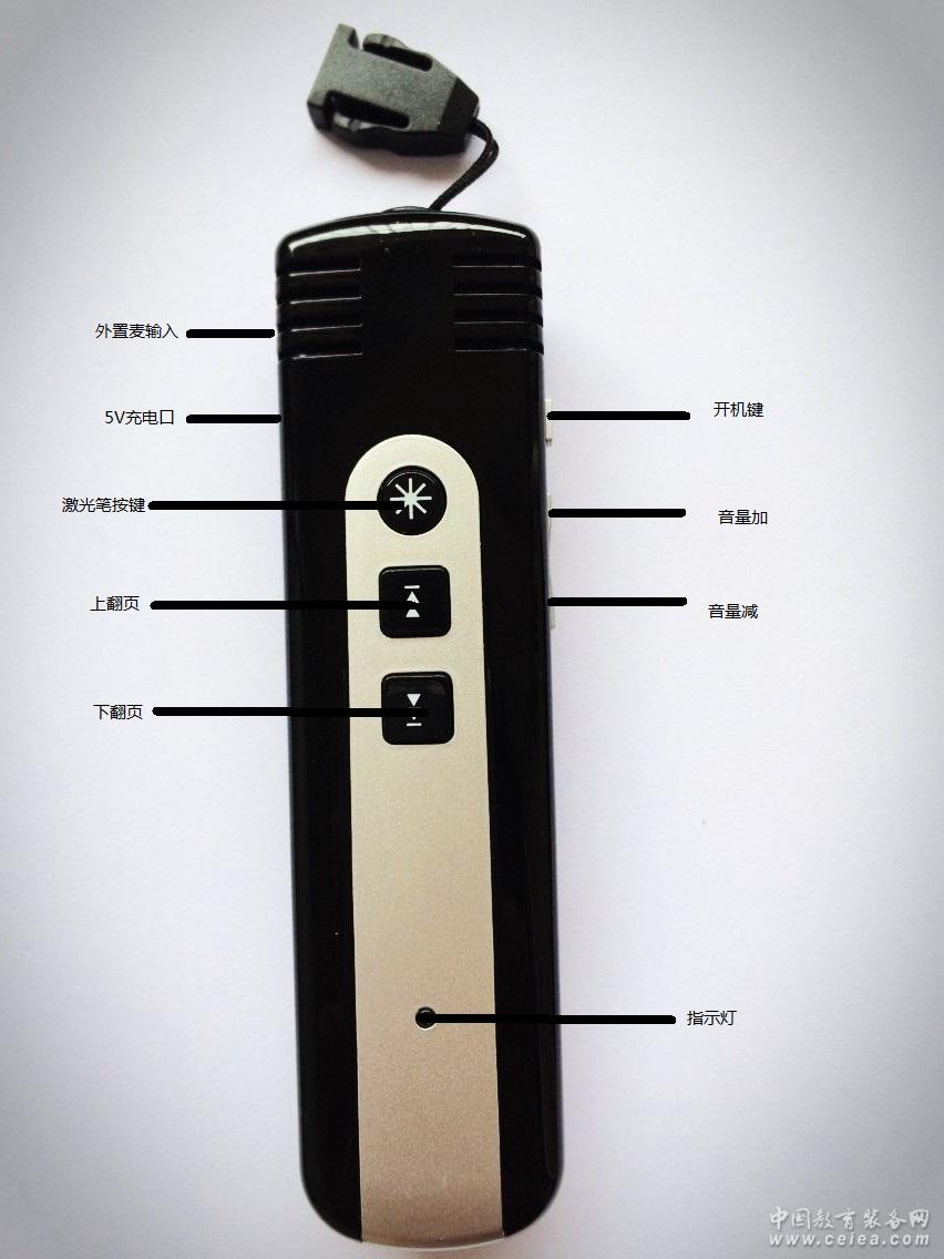 圖示一 如圖一所示,整套系統包括三部分:一個發射設備和兩個接收設備。 1.發射器總共有六個按鍵:開機鍵、音量加、音量減、激光筆鍵、電腦的上翻頁和下翻頁 2.發射器總共有兩種配對模式:一是與音頻接收模塊的一對一配對模式(紅藍燈交替閃); 二是與PTT接收模塊的廣播配對模式。 3.發射器開機默認進入音頻接收模塊的一對一配對模式,一旦發射器與接收模塊配對成功 退出一對一配對模式進放PTT接收模塊的配對模式。另外,若發射器與音頻接收模塊沒 有配對,可以按住“音量加、音量減、電腦的上翻頁和下翻頁”任一按鍵“3 秒”鐘強行退到PTT模塊的配對模式 4.音頻模塊的配對距離在4~6米;PTT模塊的配對距離在1米以內 5.本系統的音量是級別是保存在發射器上 |