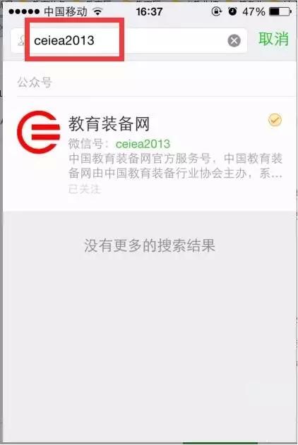 1、關注教育裝備網官方微信公眾服務號“教育裝備網(微信號:ceiea2013)”。