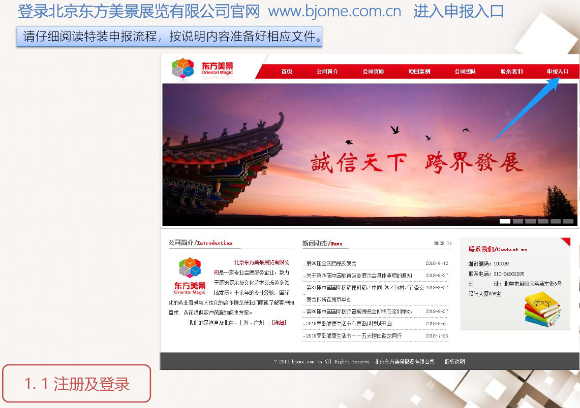 1)預審:將報館文件掃描件上傳至北京東方美景展覽有限公司網報系統(www.bjome.com.cn/declare.html);