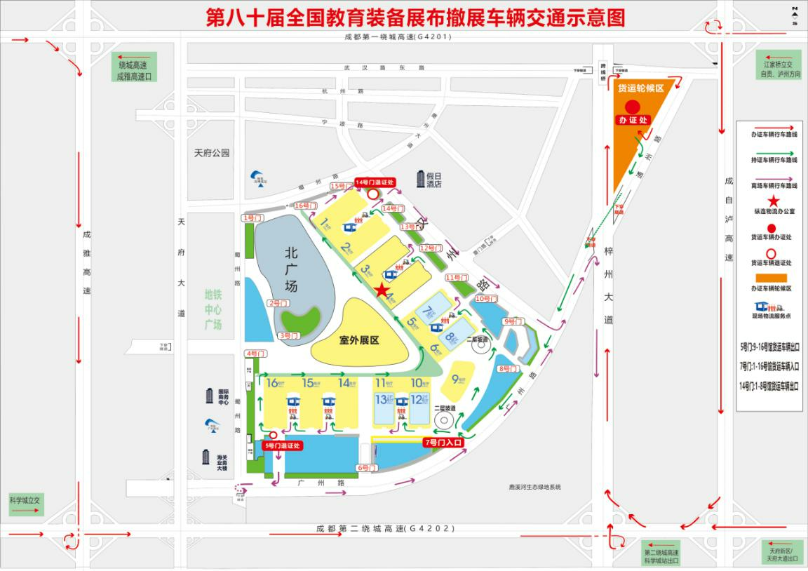 2、所有參加第八十屆教裝展布撤展貨運車輛均按照此外圍交通路線行駛,必須遵守現場交通管理,并聽從交警及現場協管人員的安排。現場工作人員結合館內裝卸實際情況,合理安排車輛辦證放行工作。